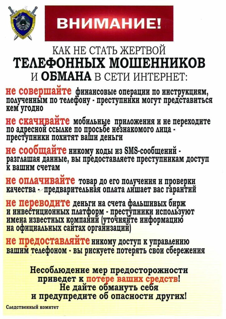 Памятка: «Как не стать жертвой телефонных мошенников и обмана в сети интернет»
