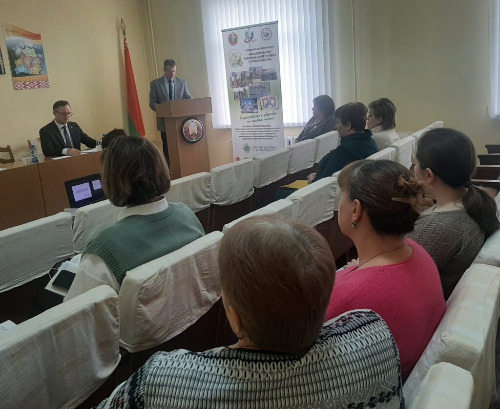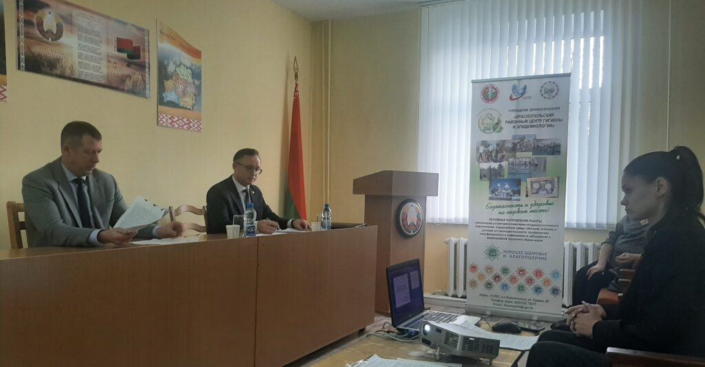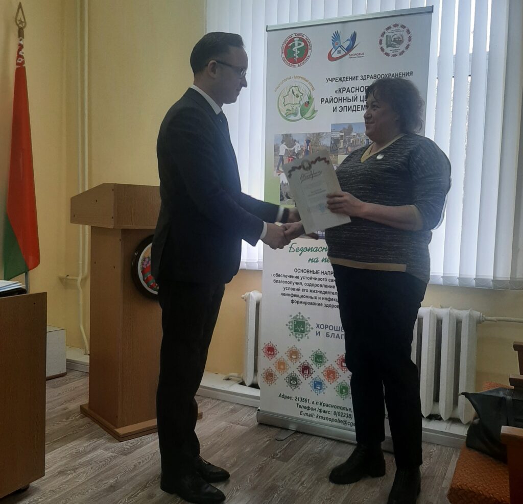 В УЗ «Краснопольский райЦГЭ» 21.01.2025 провели итоговое собрание по результатам работы за 2024 год. Участие в собрании принял Главный государственный санитарный врач Могилевской области Сакович М.Н. Определены основные направления в работе на 2025 год. За достигнутые успехи по обеспечению санитарно-эпидемиологического благополучия населения в 2024 году награждена Почетной грамотой УЗ «Могилевский облЦГЭ и ОЗ» медицинский дезинфектор Воронцова В.С., объявлена Благодарность главного государственного санитарного врача Могилевской области — главного врача УЗ «Могилевский облЦГЭ и ОЗ» пом.врача-гигиениста Крыжевской Т.Д.